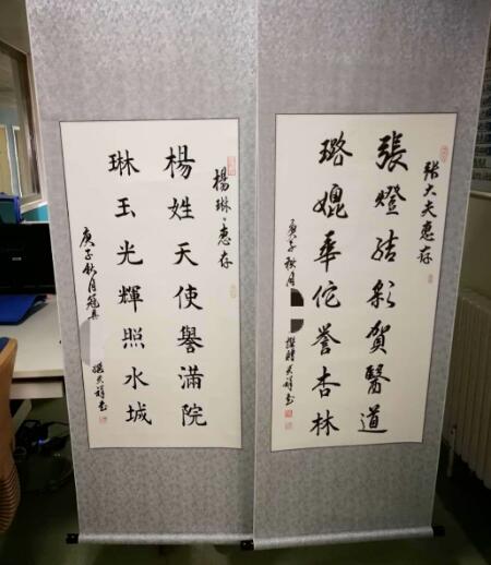 “张灯结彩贺医道,璐媲华佗誉杏林”、“杨姓天使誉满院,琳玉光辉照水城”,这两幅精美的藏头诗字画是曾在抑郁症男病房住院的患者马先生为病房送来的,藏头诗中提到的两个人分别是病房的张璐医生和杨琳琳护士,透露出满满的感激之情。